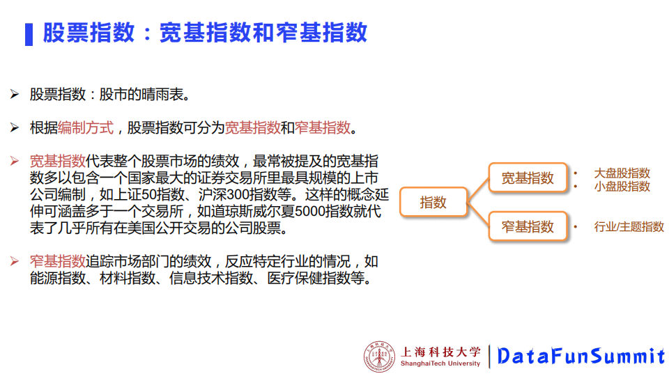 宽基指数:代表了整个股票市场的绩效,包含了一个国家最大的证券交易所里最具规模的上市公司编制。如上证50指数、沪深300指数等,它们一般包含了市场中市值比较大的那些公司,然后计算出来这样一个指数,例如全世界最大指数之一的道琼斯威尔夏5000指数,其实际包含有7000多支股票。