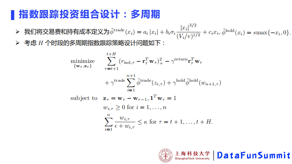 前面讲到的模型其实都是基于单周期的模型。单周期是指在每一个进行投资的时间段内,单独地进行一次指数跟踪基金的设计。但对于不同的投资阶段,需要分别进行设计,因为指数是在不断变化的。所以当从一个阶段到另外一个阶段进行投资的时候,投资比重是需要进行再调整的,最后会导致一个交易成本的问题。所以我们可以把单周期的模型扩展到一个多周期的模型,控制交易费用。