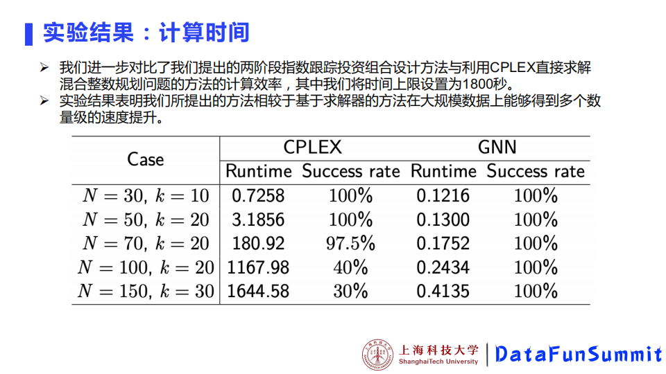 这是在计算时间上的比较,当问题规模逐渐变大的时候,CPLEX的运行时间会非常高,并且成功的概率也会非常低。但是用GNN都可以在一秒之内把问题给解决掉,并且它的成功率达到100%。