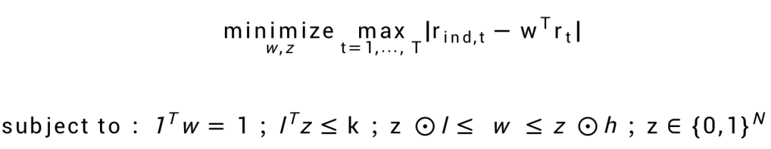 为了得到稀疏的资产组合,我们进一步引入二元变量z,zi=1表示对应资产被选入投资组合,zi=0表示对应的组合未被选入。并且设置变量k,表示我们想在这n个成分股当中最多选几支股票。比如标普500指数,可能有接近500个成分股,假如我们只需要从中选出20个股票对它们进行跟踪,那么这里的k就等于20。