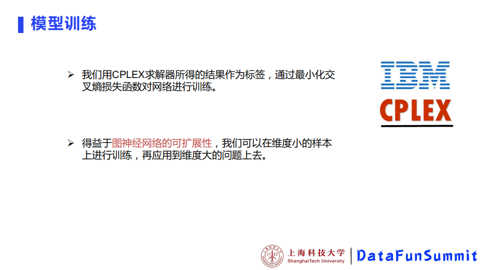我们用CPLEX求解器所求得的结果作为标签,通过最小化交叉熵损失函数对网络进行训练。因为对于这个问题,最后只要训练出一个如何能够求解混合整数规划的问题,也就是满足这样一个问题子结构的网络。所以我们的训练样本其实可以不用来自于实际数据,而用IBM的求解器CPLEX来产生。CPLEX对于小规模的问题可以很快给到一个最优解。