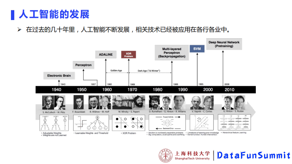 第一阶段用到的是图神经网络,这里先稍微讲一下图神经网络的背景。人工智能从40年代开始一直发展到现在,经历了起起伏伏。从最开始的Electronic Brain,发展到感知机。后来大家发现感知机很难求解非线性问题,比如异或问题。接着又发展到了多层感知机。当多层感知机层数变多的时候,在训练模型的时候复杂度会变高。在当时的八九十年代,由于计算基础设施的匮乏,大家很难去把多层感知的模型发展起来。后来统计学习蓬勃发展,像SVM算法成为了研究的主流。近些年由于高效的计算与存储设备的出现,深度神经网络获得了重生。