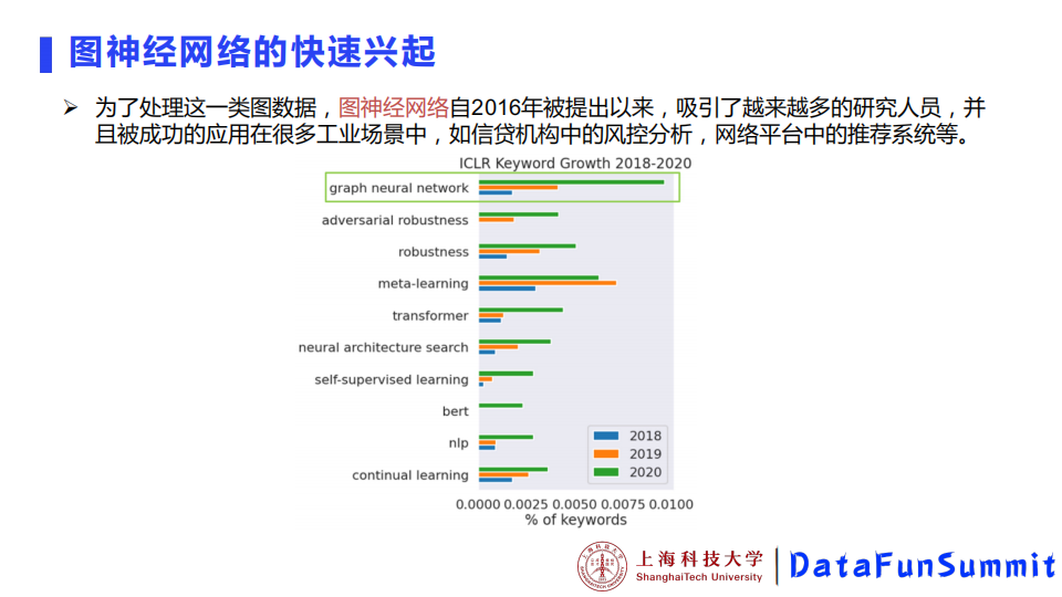 如图中下方所示,在机器学习领域顶会ICLR上可以看出,过去三年关于图神经网络的发文数量迅速上升,到现在还是一个最火爆的话题。