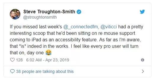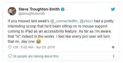 在Federico Viticci做完这期博客节目之后,时常爆料iOS功能的开发者斯蒂夫‧史密斯(Steve Troughton-Smith),也就是前段时间声称iOS 13将提供深色模式、多窗口、三指撤销手势等功能的爆料者,响应了该编辑的说法。他表示,据他所知,苹果让iOS支持鼠标的功能“确实正在开发中”。