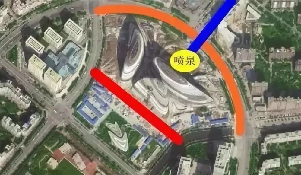 我们还可以看到,为了缓解路冲煞,设计师在望京SOHO建了一个喷泉,但是奈何煞气太冲,不能根本杜绝。