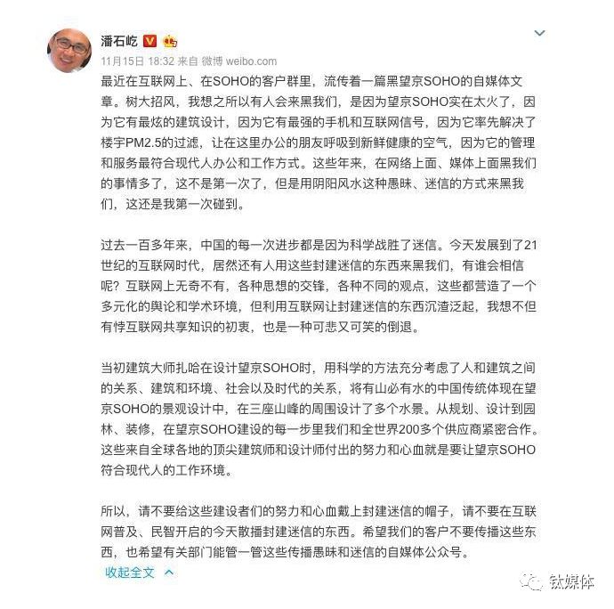 但是潘石屹对于诸多风水分析却不以为然,在2018年底,潘石屹发文怒怼风水之说。潘石屹这篇六百余字的微博,从建筑人文、设计风格、网络信号、PM2.5过滤等方面,对望京SOHO的办公环境进行了强力背书,并呼吁客户不要传播风水之说。但是潘石屹忘了几年前还大讲望京SOHO风水好,适合互联网企业吗?