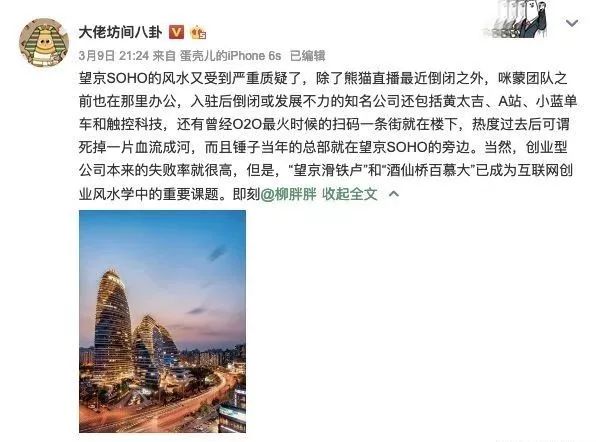 3月9日,微博博主“大佬坊间八卦”发了一条微博,谈论入驻望京SOHO后倒闭或发展不力的互联网公司。