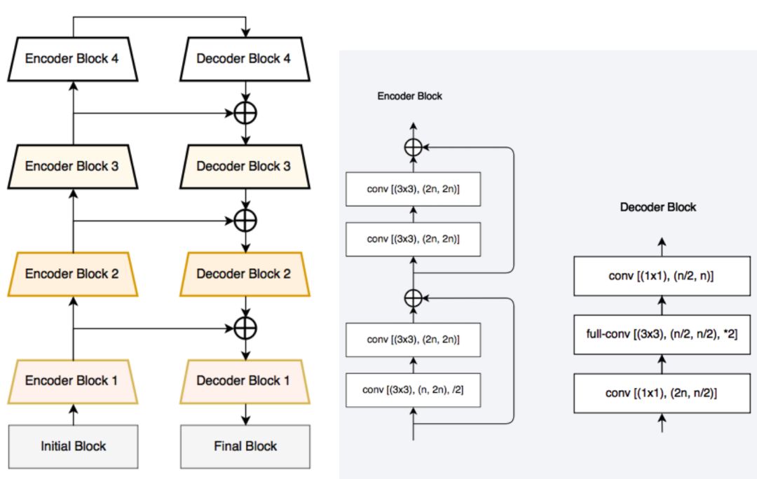图11:(左)LinkNet 架构,(右)LinkNet 中使用的编码器和解码器模块