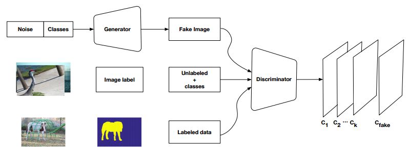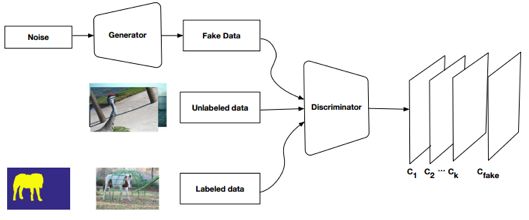 基于生成对抗网络(GANs),我们提出了一种半监督框架,它包含一个生成器网络以提供用于多类别分类器的额外训练样本,以此作为 GAN 框架中的判别器,从 K 个可能的类中为样本分配一个标签 y 或者将其标记为一个假样本(额外的类)。为了确保 GANs 生成的图像质量更高,并改进像素分类,我们通过添加弱标注数据来扩展上述框架,即我们向生成器提供类级别的信息。