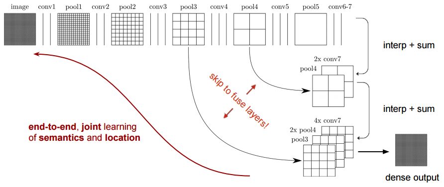 另一方面,池化和带步长的卷积对语义分割是不利的,因为这些操作造成了空间信息的丢失。下面列出的大多数架构主要在解码器中使用了不同的机制,但目的都在于恢复在编码器中降低分辨率时丢失的信息。如上图所示,FCN-8s 融合了不同粗糙度(conv3、conv4和fc7)的特征,利用编码器不同阶段不同分辨率的空间信息来细化分割结果。