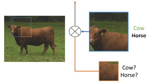 图 14:图片展示了全局空间上下文对语义分割的重要性。它显示了层之间感受野和大小的关系。在这个例子中,更大、更加可判别的感受野(蓝)相比于前一层(橙)可能在细化表征中更加重要,这有助于解决歧义。