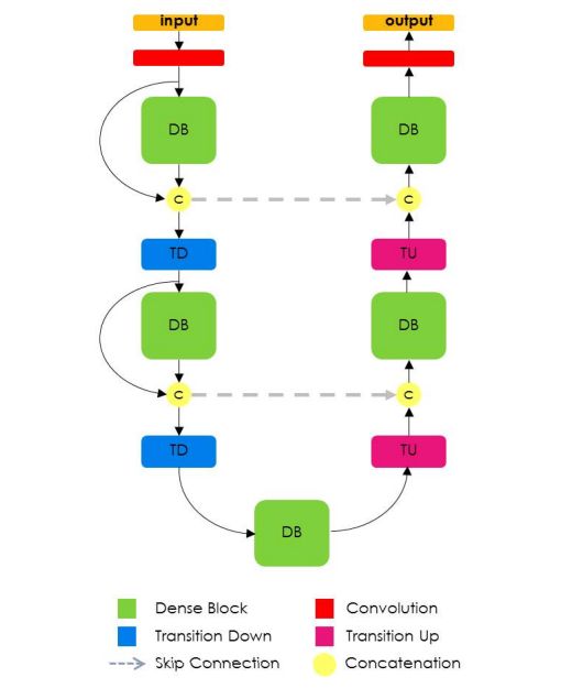 全卷积 DenseNet 使用 DenseNet 作为它的基础编码器,并且也以类似于 U-Net 的方式,在每一层级上将编码器和解码器进行拼接。