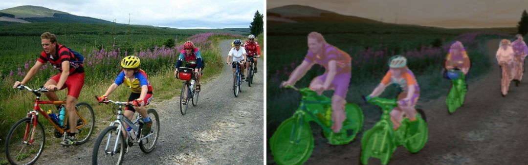 图1:输入图像(左),FCN-8s 网络生成的语义分割图(右)(使用 pytorch-semseg 训练)