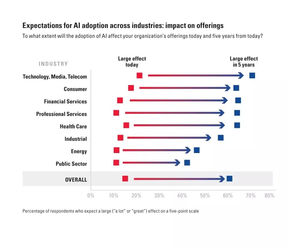 图说 | 各行业 AI 采用程度: 对产品服务影响程度(来源:MIT Sloan Management Review)