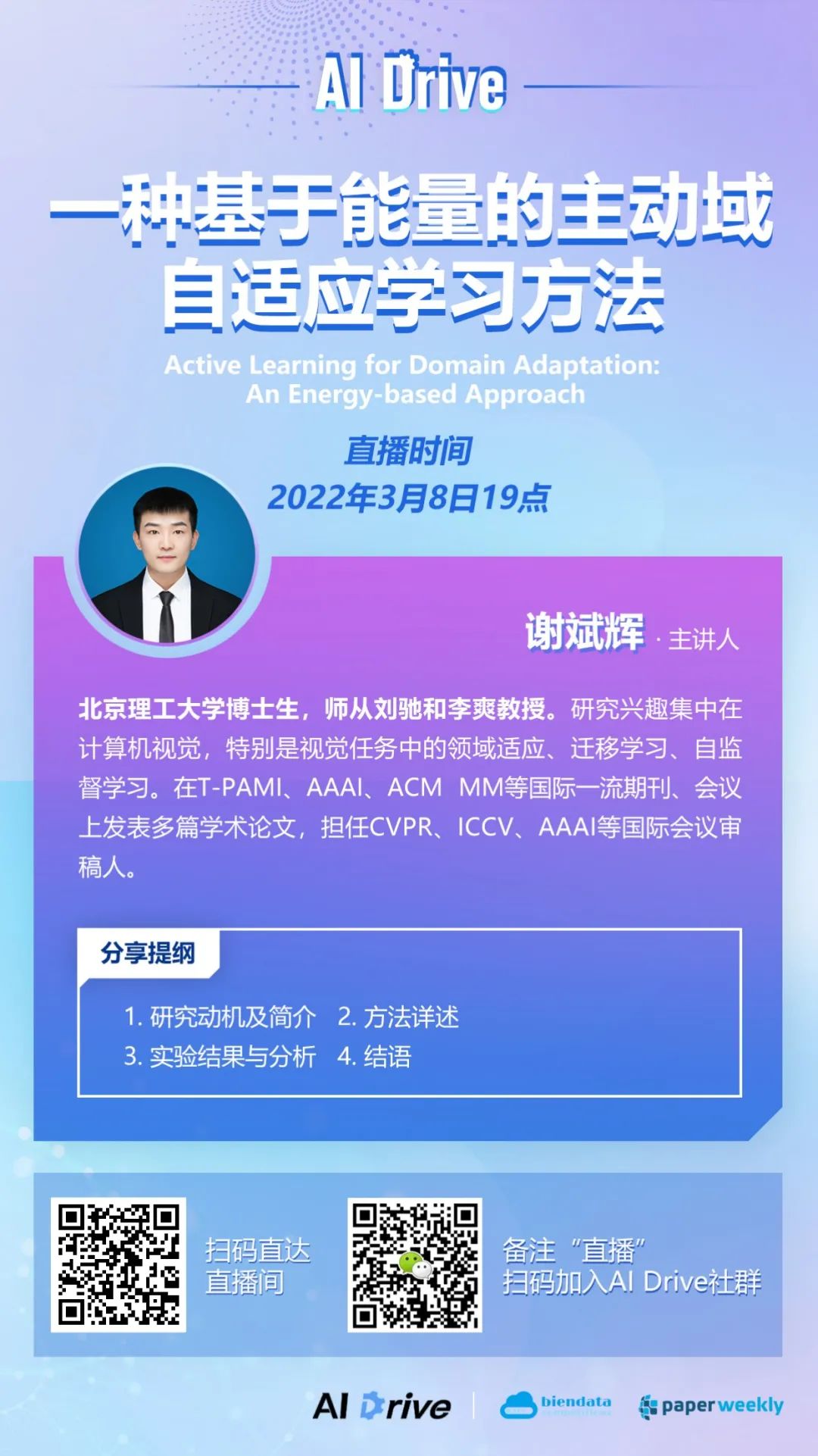 本期 AI Drive,我们邀请到北京理工大学博士生谢斌辉,为大家在线解读其发表在 AAAI 2022 的最新研究成果:Active Learning for Domain Adaptation: An Energy-based Approach。对本期主题感兴趣的小伙伴,3 月 8 日(本周二)晚 7 点,我们准时相约 PaperWeekly 直播间。