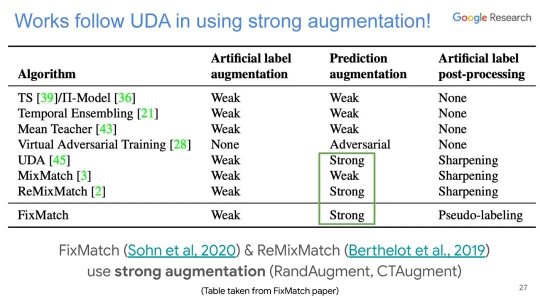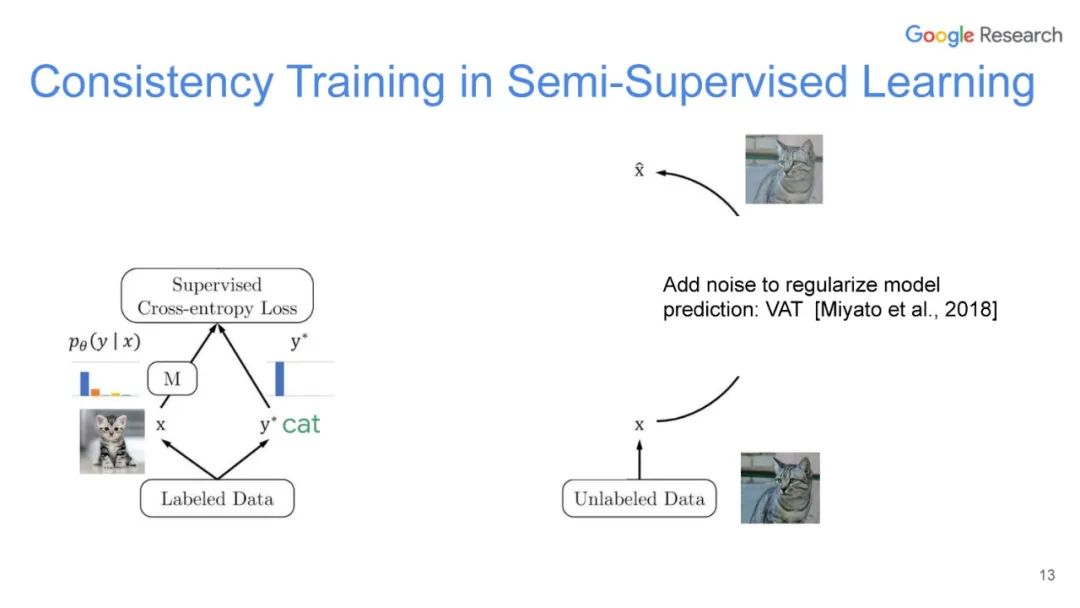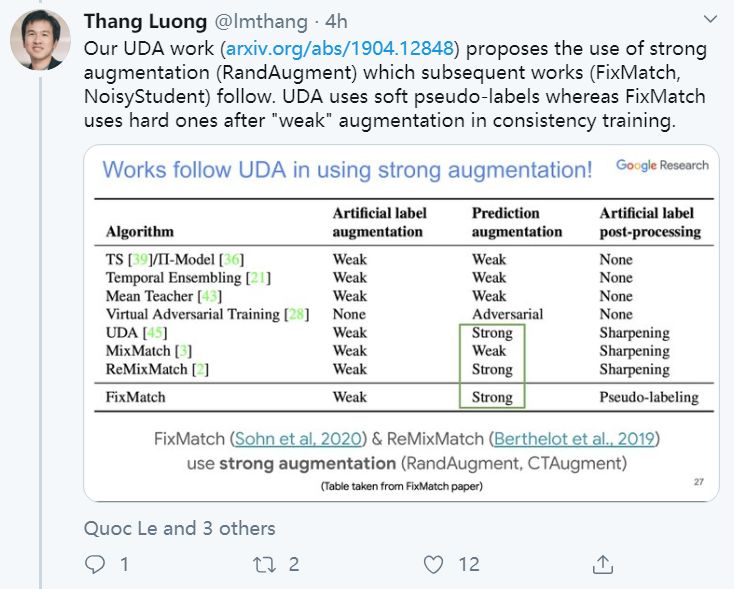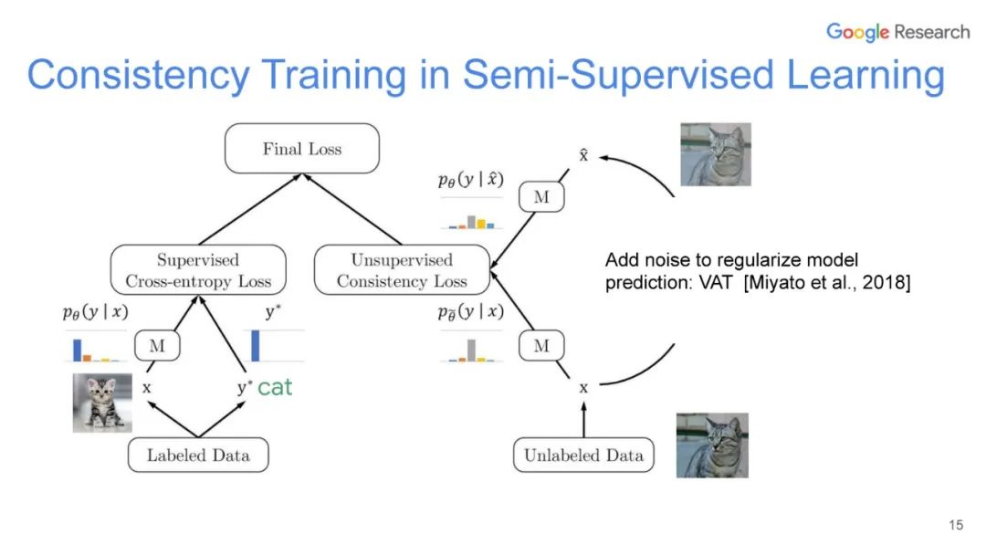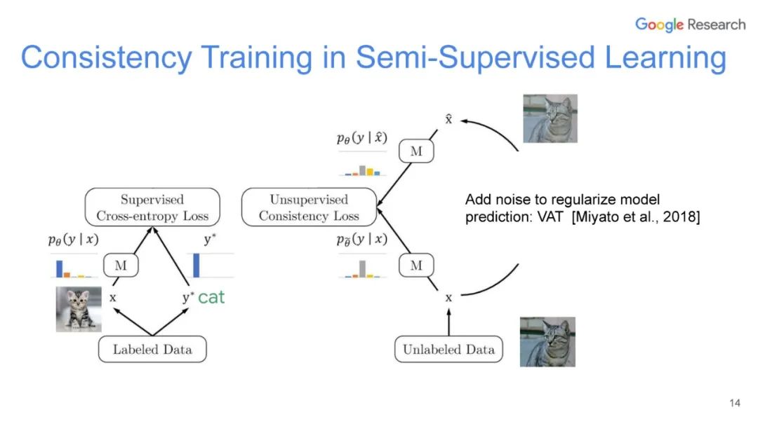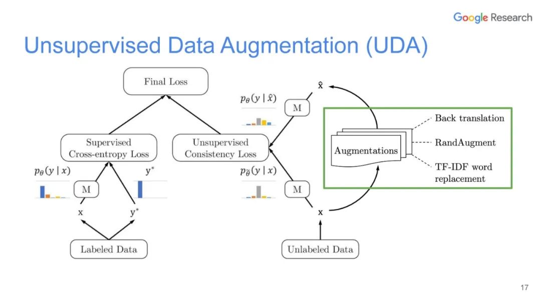 该方法思路也比较简单:对于带标签数据,直接计算分类损失;对不带标签的增广后的数据,计算模型当前对其的预测值与原始数据的预测的KL散度损失,最终两种损失按一定比例相加得到最终损失。