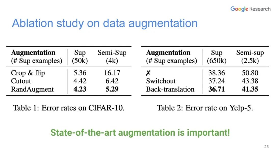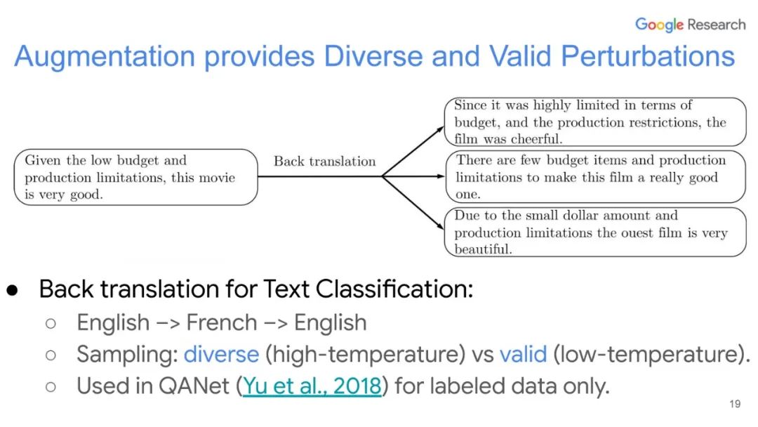 本篇文章探索了多种增广数据的方法,除了图像领域的旋转、扭曲方法等,也包括NLP领域的反向翻译(Back-translation)和TF-IDF词替换,对比它们对于半监督学习效果的影响,证明了有针对性的数据增强效果明显优于无针对性的数据增强。同时,本文章还提出了一种训练技巧——TSA“数据退火算法”,用于解决对于少量的有标签数据,模型前期快速过拟合的问题。