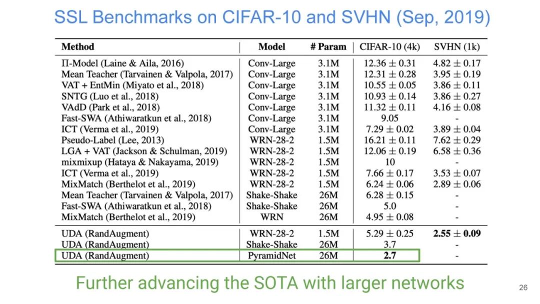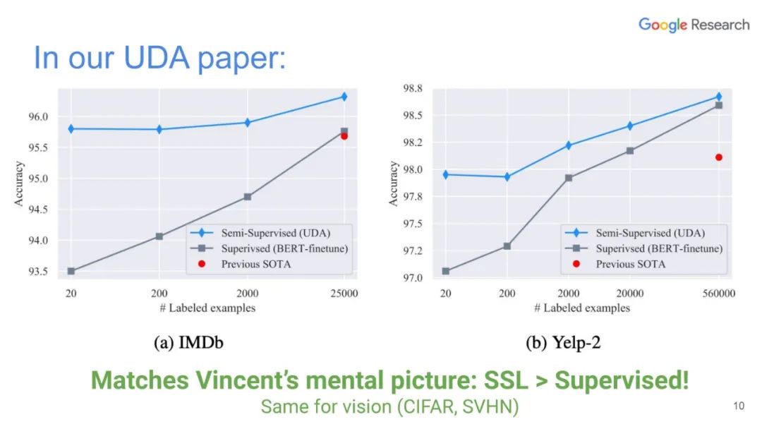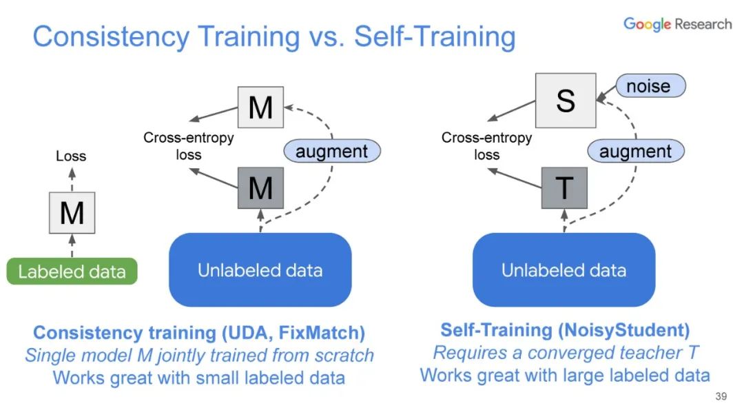 深度学习尽管取得了很大成功,但通常在小标签训练集中表现不佳。利用未标记数据改善深度学习一直是一个重要的研究方向,其中半监督学习是最有前途的方法之一。在本次演讲中,Luong博士将介绍无监督数据增强(UDA),这是我们最近的半监督学习技术,适用于语言和视觉任务。使用UDA,我们仅使用一个或两个数量级标记较少的数据即可获得最先进的性能。