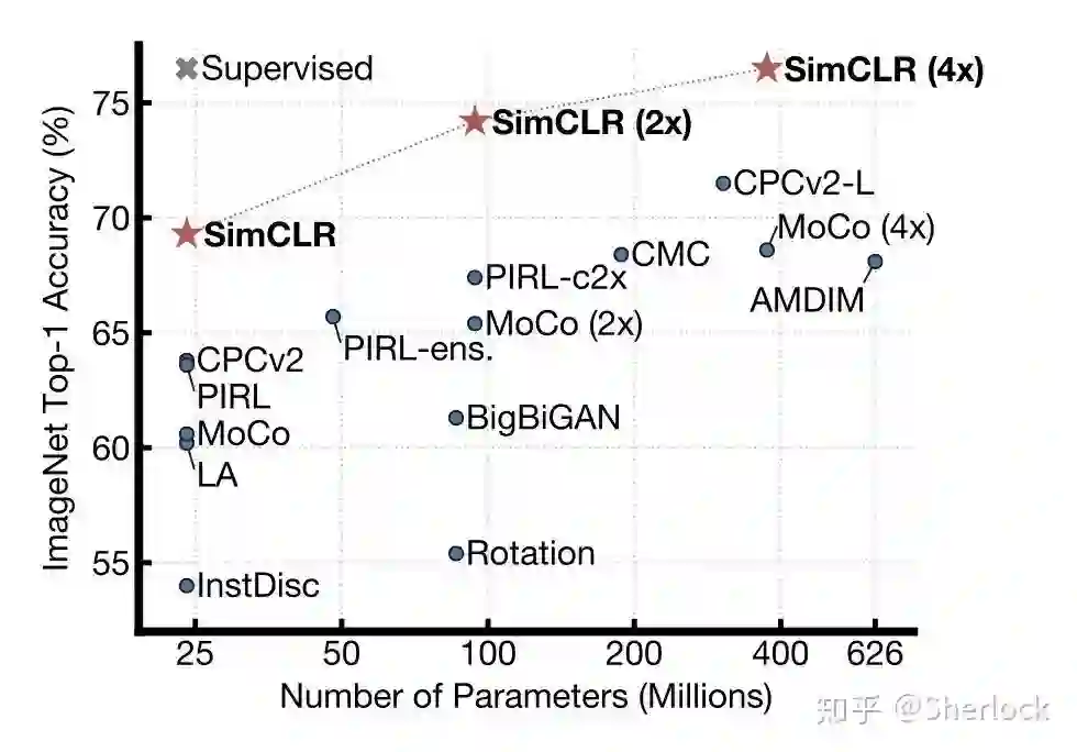 所以通过自监督学习,我们可以做的事情可以远超过监督学习,也难怪 Yann 未来看好 self-supervised learning。目前出现的性能很好的文章主要是基于 contrastive 的方法,所以下面我们介绍几篇基于 contrastive 方法的文章。
