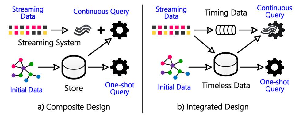 传统流式处理与数据库系统(左)与Wukong+S(右)的比较 (图片来源:Stateful Stream Querying over Fast-evolving Linked Data, SOSP’17)