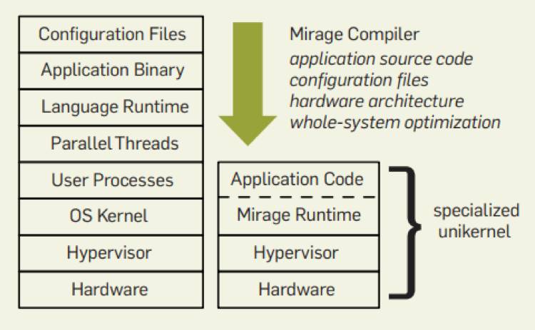 为应用定制的Unikernel (右) 与Linux (左) 的比较(图片来源:Unikernels: The Rise of the Virtual Library Operating System, ACMQueue, Jan. 2014)