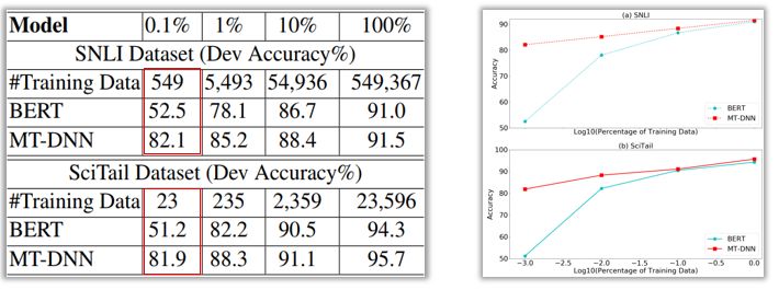 与BERT相比,MT-DNN在SNLI和SciTail数据集上的精度更高。