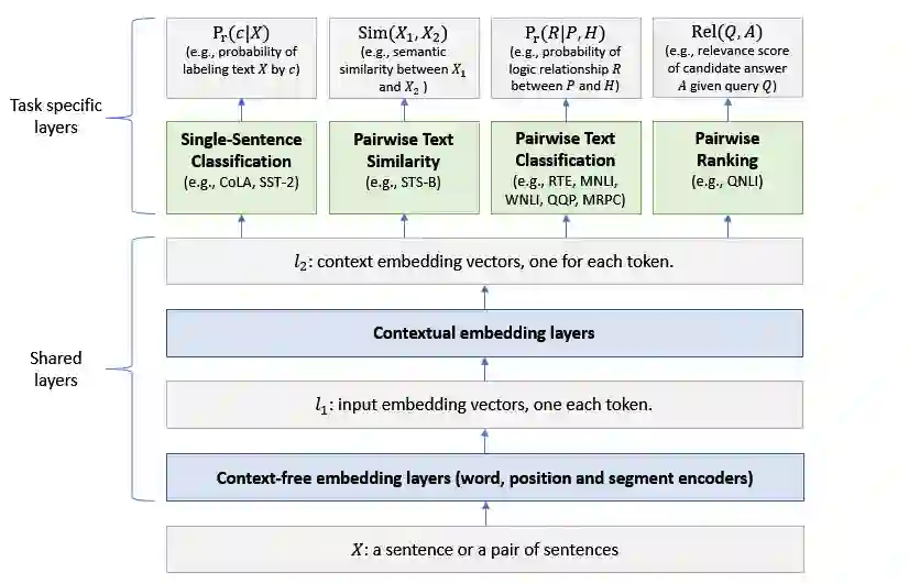 最后,对于每个任务,额外的 task-specific 的层生成特定于任务的表示,然后是分类、相似度评分或相关性排序所需的操作。MT-DNN使用BERT来初始化它的共享层,然后通过MTL改进它们。