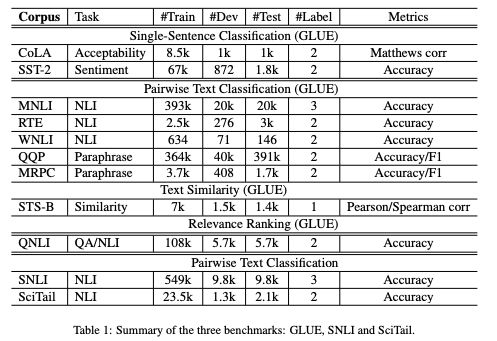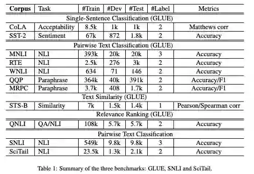 在GLUE、SNLI和SciTail 3个benchmarks上的结果