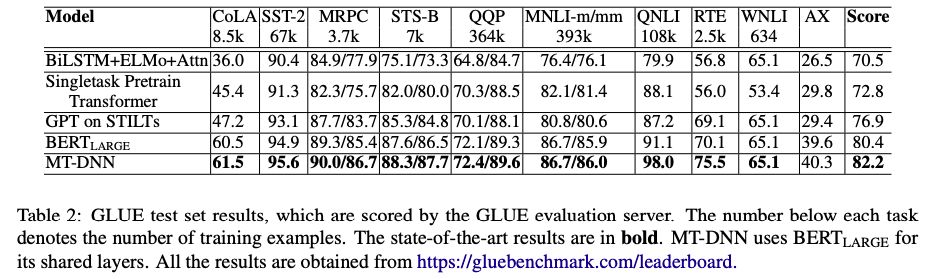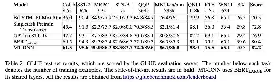 在GLUE测试集的结果,MT-DNN在10个任务上的结果均超越了BERT