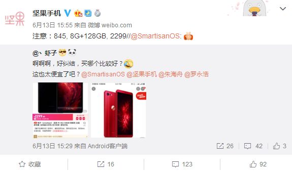 与此同时,最近火爆的年中618也是让锤子老款机型得到了大幅降价。近日,有网友赞叹道坚果R1与坚果Pro 2s 618价格相当便宜,坚果手机官方微博转发评论道:“注意:845, 8G+128GB, 2299。”