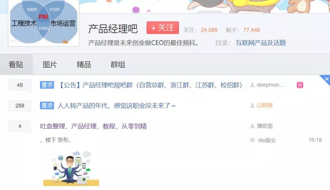 以产品经理吧为例,点进去之后大多数内容是培训广告,此外还有卖盗版视频的,写软文的,反正就是没有正儿八经分享的。偶尔有个人说是分享,结果还得先加QQ,除了资源获取相当不流畅之外可能还会遇见骗子。