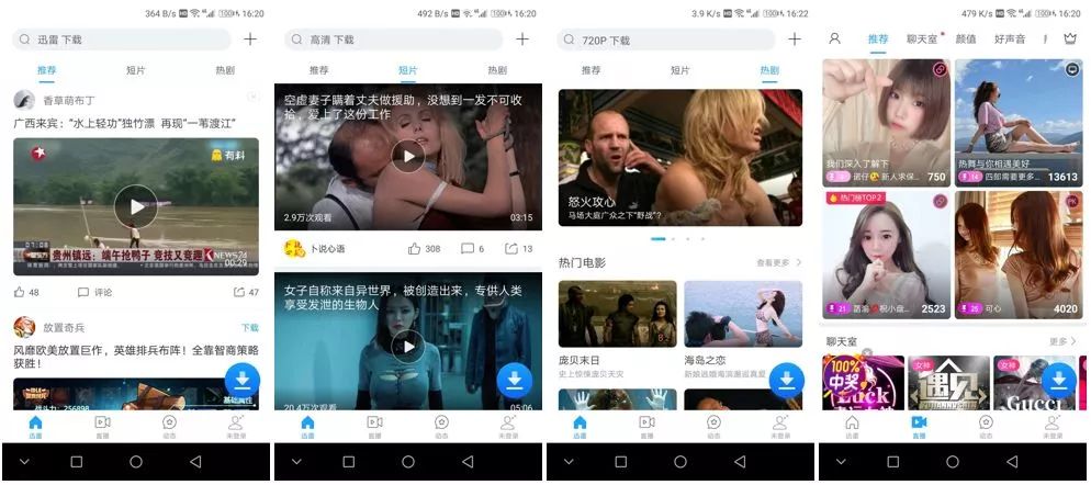上图为迅雷APP的四个核心内容页面,首页中有推荐,短片和热剧,排第二的是直播功能。从功能上讲就是短视频+视频+直播的组合体。