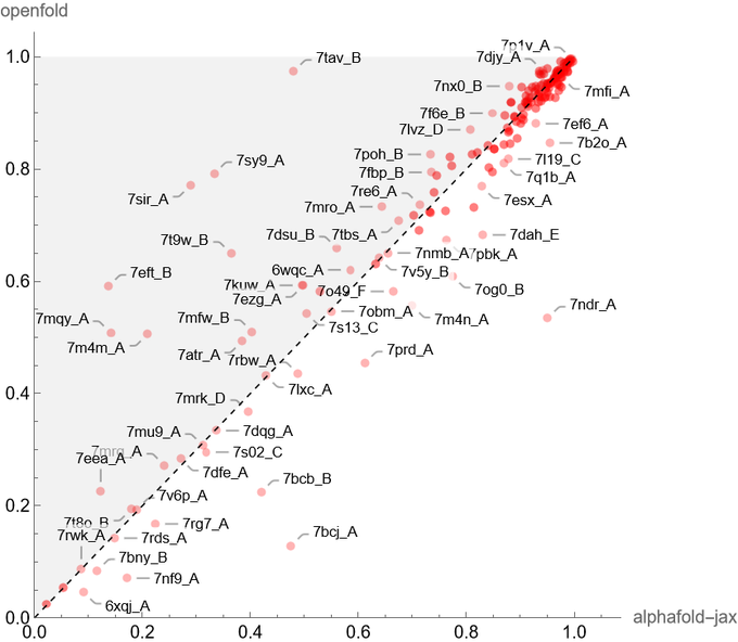 OpenFold 与原版 AlphaFold2 的准确率相当,甚至略胜一筹,可能因为 OpenFold 的训练集更大一点: