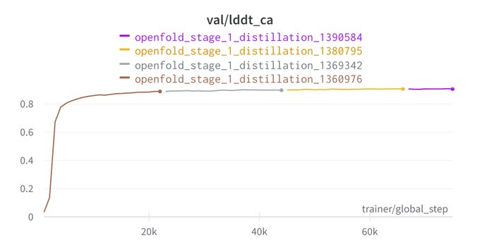这次哥伦比亚大学 Mohammed AlQuraishi 教授等人实现的 OpenFold 总训练时间大约为 100000 A100 小时,但在大约 3000 小时内就达到了 90% 的准确率。