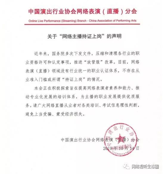 此前媒体报道的“网络主播持证上岗”一事,中国演出行业协会今天回复:目前,网络表演(直播)领域没有行业统一的职业认证体系,不存在从业准入门槛或所谓“持证上岗”的情况。