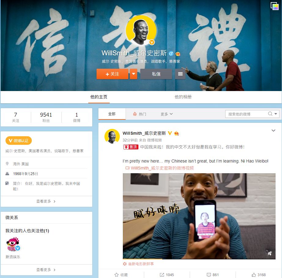 新榜讯 今日(10月14日),好莱坞小视频网红威尔·史密斯开通过微博并发布第一条打招呼视频。据了解,威尔·史密斯出演了李安导演的新作《双子杀手》,今日也将亮相中国首映。