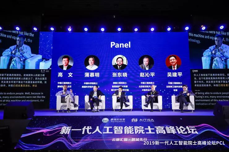 在上午场的Pannel环节, 蒲慕明 院士 、 高文 院士 ,与美国工程院院士、南方科技大学学术副校长兼教务长 张东晓 ,中国工程院院士、北京航空航天大学学术委员会主任 赵沁平 ,中国工程院院士 吴建平 一同登台,就「人工智能的发展现状以及未来能够做哪些尝试」这一议题表达自己的观点。