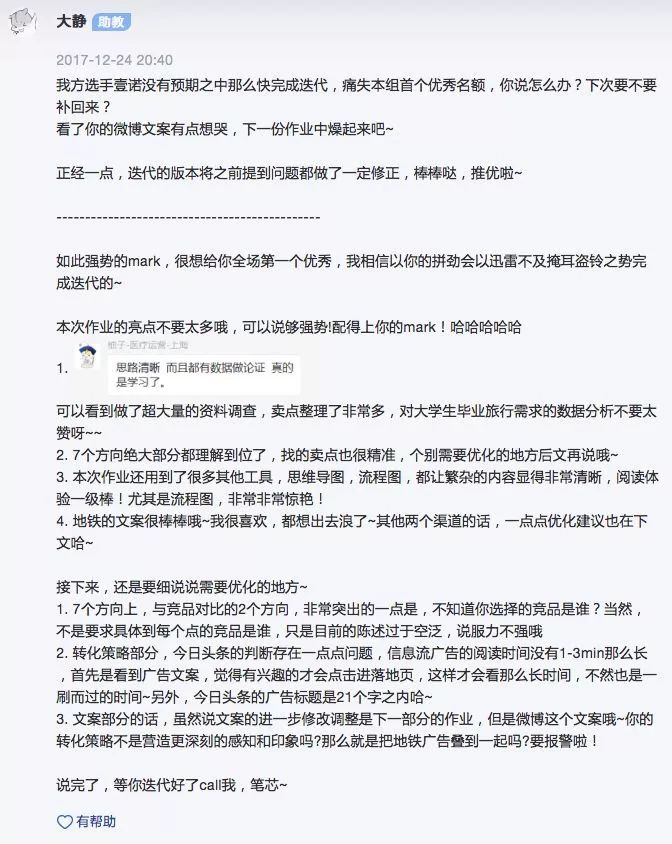 3)我们的课程确保每一份作业都会得到助教一对一的批改、点评和指导。并且为了保证批改质量,我们的助教全部来自于往期课程的优秀学员。