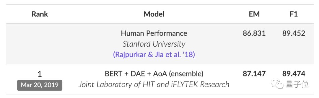 哪怕是在XLNet等后来者的冲击之下,BERT在SQuAD2.0排行榜上仍处于霸榜的地位,前10名中有6位都是BERT的变体。其中第一名BERT + DAE + AoA的表现甚至超过了人类。