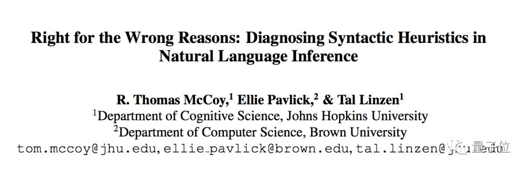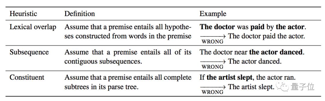 这篇论文里BERT是在多类型语言推理数据集 (MNLI) 上训练的,而测试集则是研究团队自制的HANS数据集:
