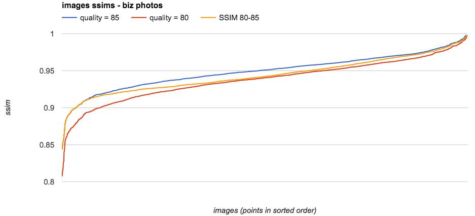 最后,橙线代表我们最终选择的动态质量设置,SSIM 80-85,我们会选择满足或超过 SSIM 比值范围的图片,具体为质量介于 80 至 85(含)之间的图片,而这个比值是一个预先计算出来的静态值,借此可确保只针对质量介于该范围之间的图片进行转换,这样便可以在不降低质量最低图片的质量同时降低文件平均大小。