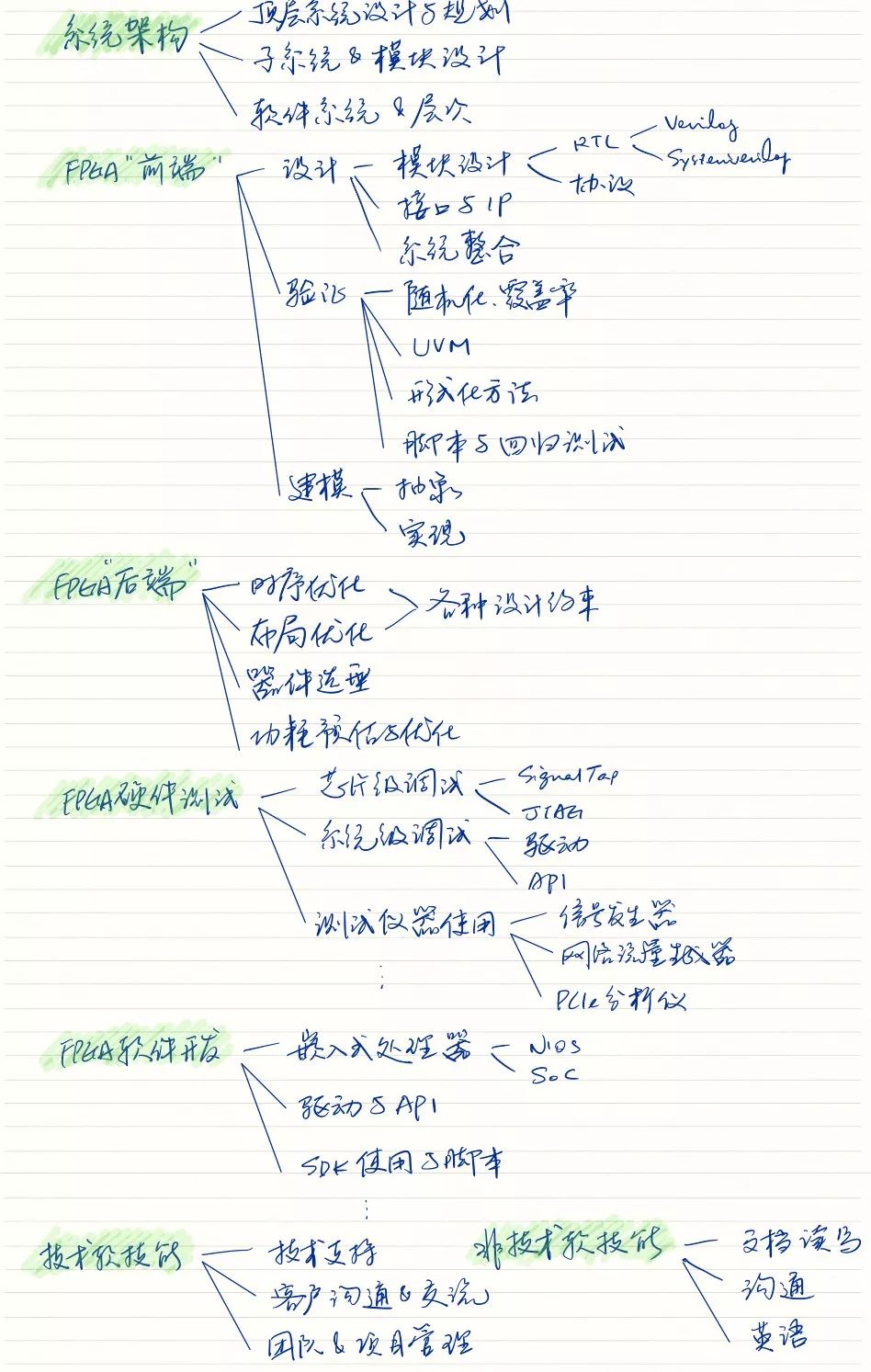我随手写了一下 FPGA 工程师的全栈技能树,见下图,尽管很不完整,但仍可供大家参考。之前很多人提到的,诸如调试与分析的能力,其实是这个全栈技能树里的一片树叶,或一个分支。