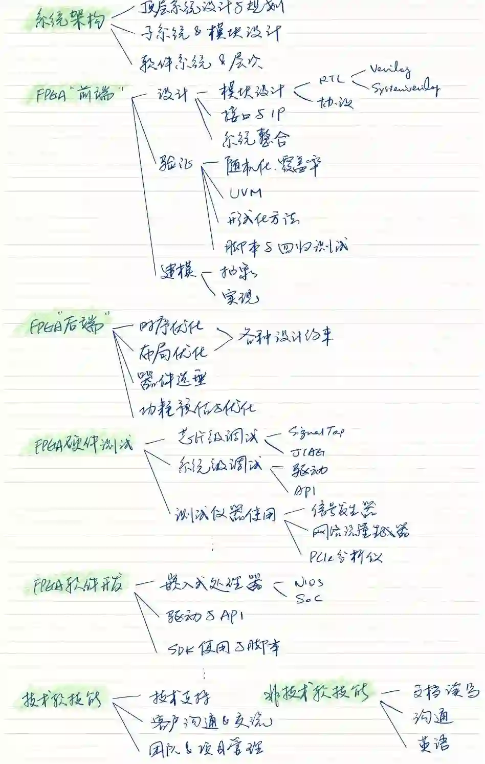 一般来说,如果一个 FPGA 工程师能在这个 FPGA 技能栈里精通某一项,就可以成为这个领域的大牛和权威。比如,像很多人提到的,如果你特别会调板子,硬件调试能力很强,那你就可以很好的负责项目中的硬件测试环节。再比如,你 RTL 写得很好,或者验证很强,或者对系统架构有很深的理解,你都能在项目里成为不可或缺的人。