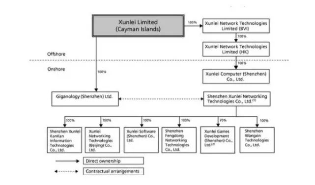 其中,前者全资持有迅雷网络科技有限公司(香港),这是迅雷在香港的实体运作公司;后者对迅雷在国内的实体运作公司深圳市迅雷网络技术有限公司进行协议控股。