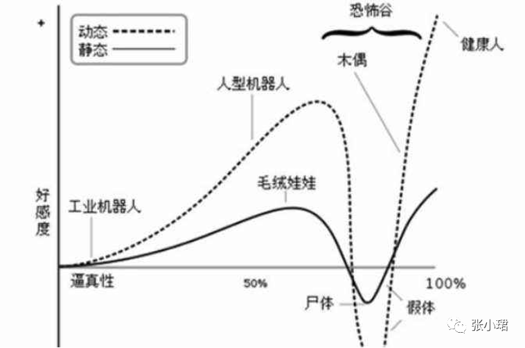 在谷底,这个大型机器人,像人又不极致,比如像僵尸,没办法做到惟妙惟肖。这个时间段人看到就发怵——它像我,又不是我,动作很怪,很瘆人——这个地方叫“恐怖谷”。再往后发展,机器人长得跟人一模一样,最后分不出是人还是机器了,人对机器人的好感又会提升。