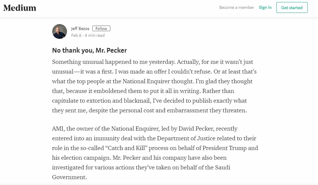 贝索斯在Medium上发布博客,详述自己遭到“National Enquirer”的敲诈勒索经历