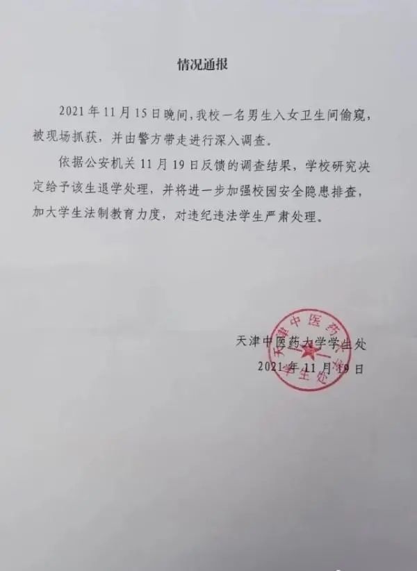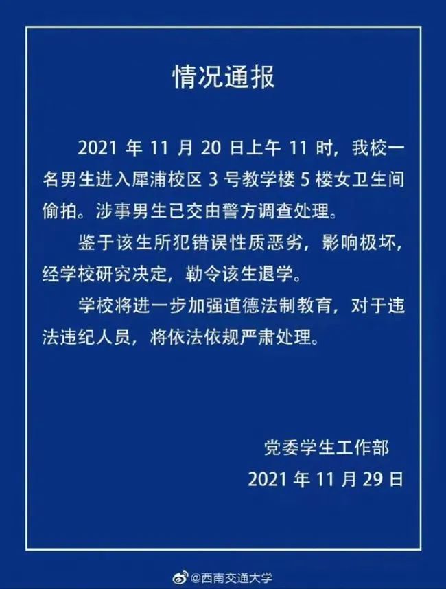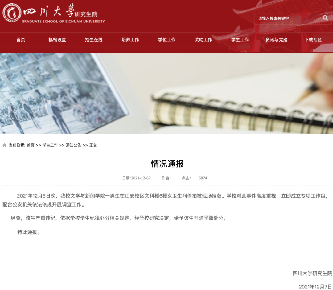 12月7日,四川大学研究生院网站发布情况通报:2021年12月5日晚,四川大学文学与新闻学院一男生在江安校区文科楼6楼女卫生间偷拍被现场挡获。学校对此事件高度重视,立即成立专项工作组,配合公安机关依法依规开展调查工作。经查,该生严重违纪,依据学校学生纪律处分相关规定,经学校研究决定,给予该生开除学籍处分。全文如下: