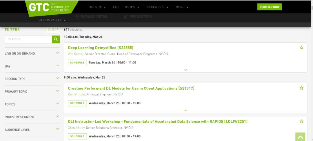 您也可以根据时间、类型、主题、行业、难度等维度筛选适合您的内容分享,包括网络直播研讨会、DLI 深度学习学院培训,以及与技术专家连线环节。数百个线上干货议程任你挑!