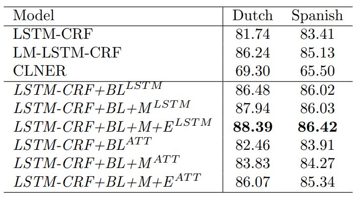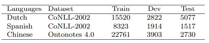我们在西班牙语、荷兰语和中文上进行实验,其语料如下表2所示