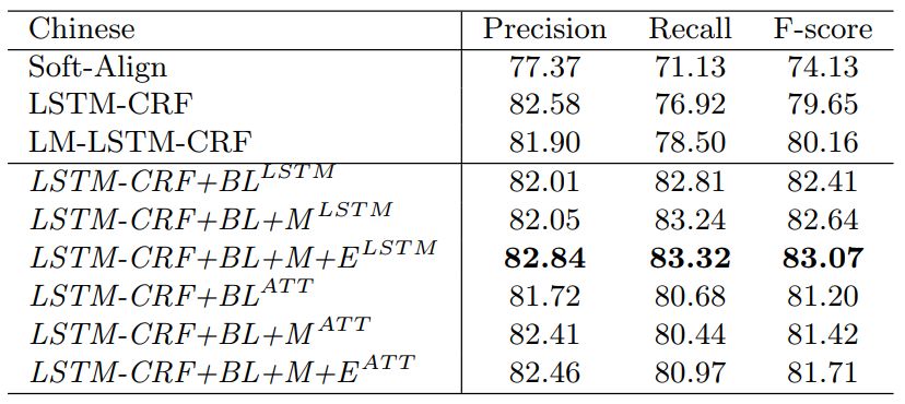 我们将自己所提的方法进行了不同的模型组合,其西班牙语和荷兰语结果如表3所示,中文结果如表4所示,均显示我们的方法获得了最好的效果。